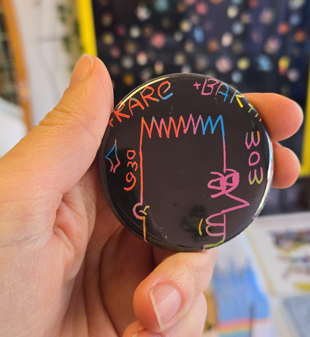 2.25 x 2.25 metal buttons, you will receive one at random! 1 out of 21 chance of getting the rare rainbow scratch BARTH (WEB SPECIAL)