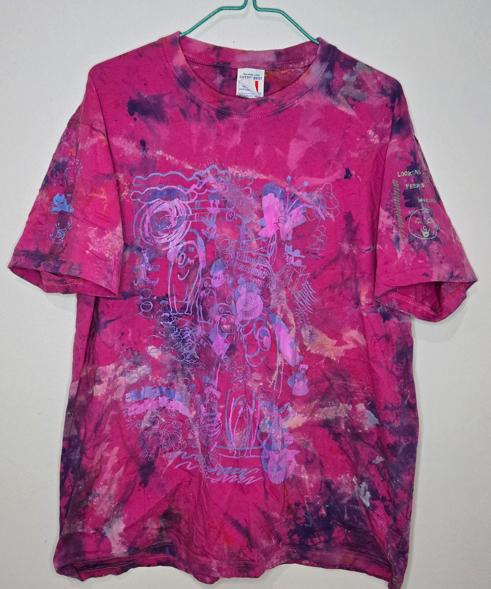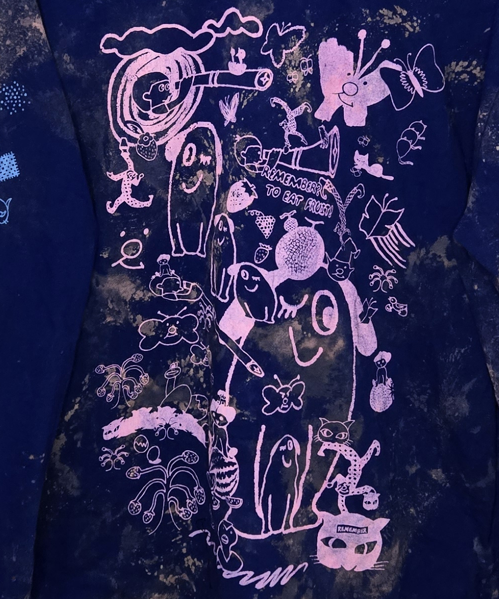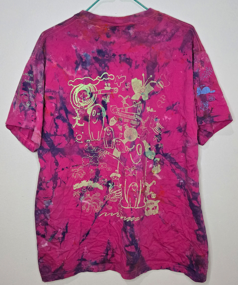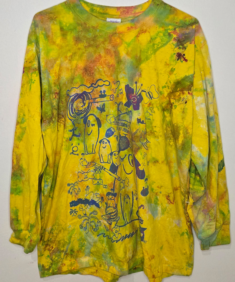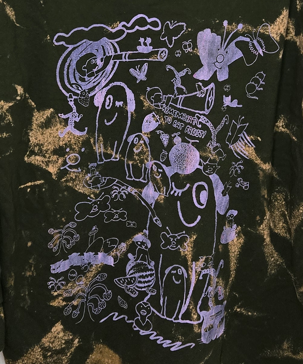 All garments below have been hand-dyed and/or bleached, hand-washed, silkscreened and finally treated with heat to cure the ink. Every piece is unique due to the above process. This collection features the same design on the front and back of each garmet (sometimes with additional shadow layers or gradients etc), all have identical designs on all of the right arms and another design appears on all of the the left arms. The short sleeved shirts only feature parts of both full sleeve designs due to space constraints. PS It is always best to wash brightly dyed and silkscreened garments with cold water to better preserve the colours.